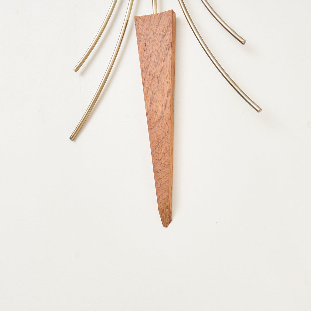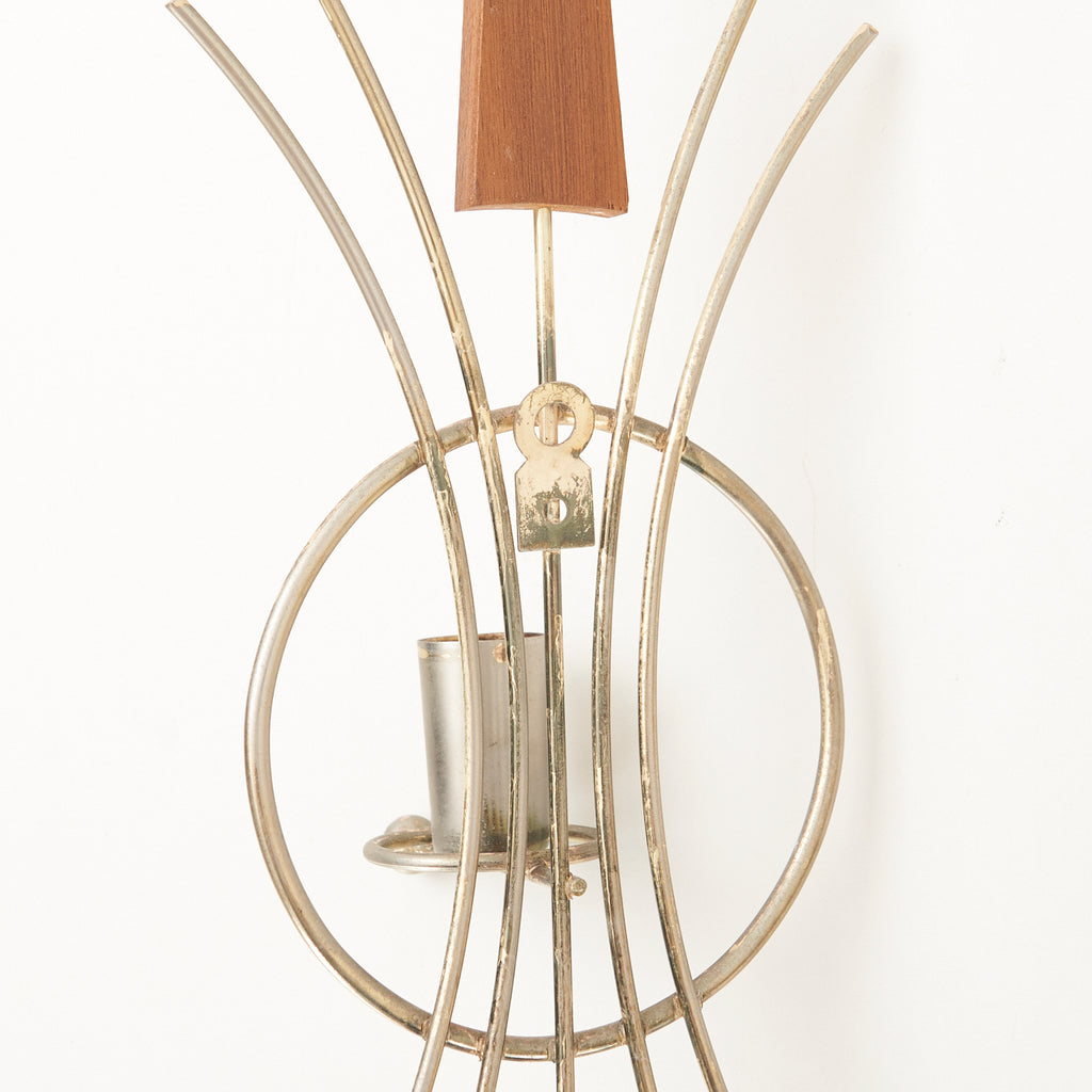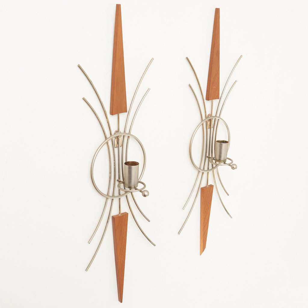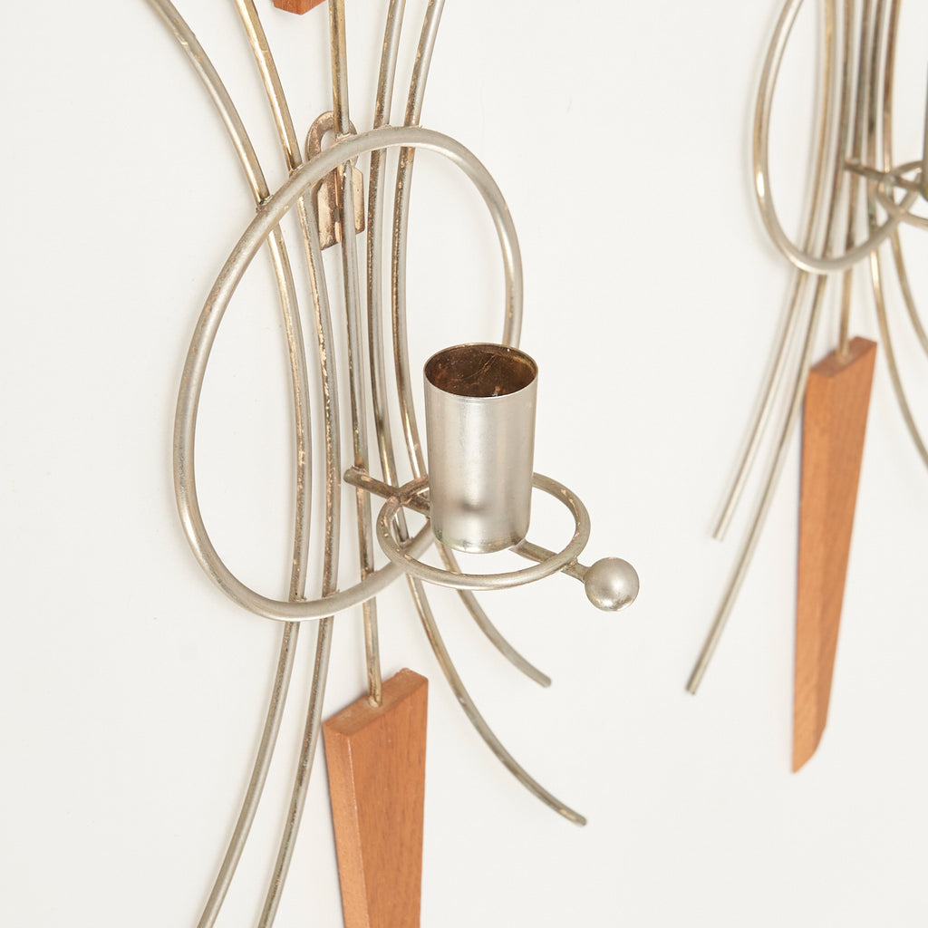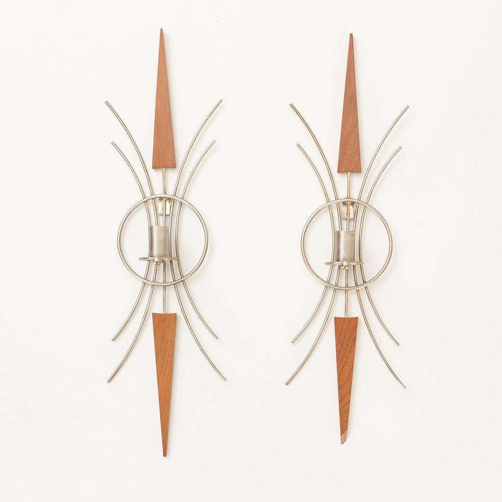 Condition: Very Good, light wear. One chip to teak at base of one sconce, see photos.